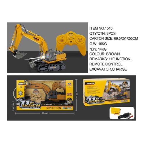 Regala a tus hijos una espectacular retroexcavadora de juguete de marca Huina, con control remoto, de material de aleación y escala 1:16. Especial para jugar e interactuar con los niños y enseñarles algunas etapas de la ingeniería y la construcción. Posee un cubo de metal de material fundido a presión, consta de 11 funciones, luces, sonidos, avance, retrocede y gira en todas las direcciones. Frecuencia 2,4 ghz. Simula la manipulación de una retroexcavadora. Medidas de la caja : 26 cm x 48,5 cm x 16 cm. Las imágenes son solo referenciales