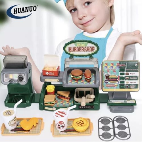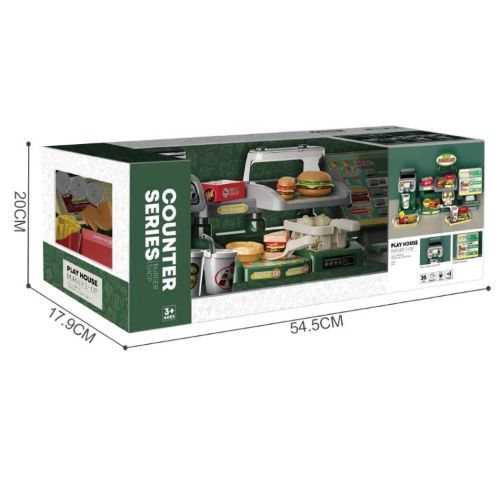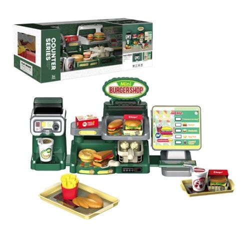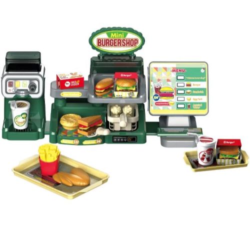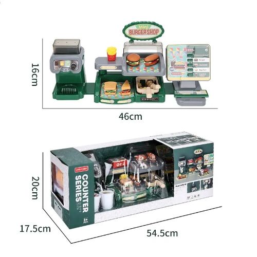 Burger Shop es un juguete de simulación de un local de venta de hamburguesas, especial para interactuar con los niños y que de esta forma puedan entrenar su imaginación y aprendan a gestionar su propias ventas. Contiene 35 piezas, usa agua para simular la preparación de café, posee pantalla táctil, caja registradora, sonidos y además cuenta con una serie de accesorios para hacer de este juguete, una entretenida diversion. Usa pilas 3A por lo que su uso es recomendado para niños mayores de 3 años y con supervisión de un adulto. Medidas informadas son las medidas de la caja incluyendo todos los accesorios : 20 cm x 54,5 cm x 18 cm. Las imágenes son solo referenciales,