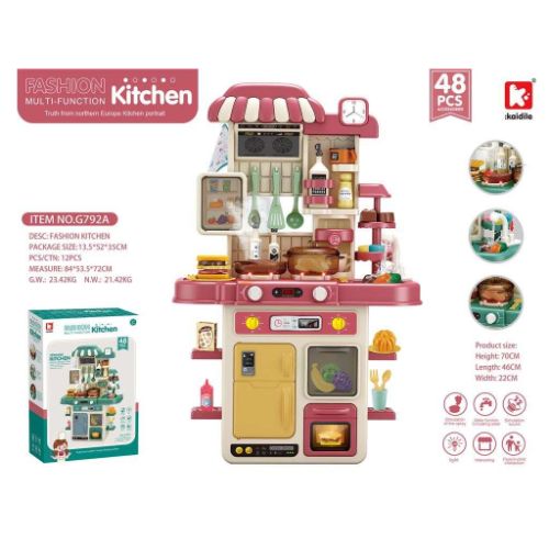 Regala una espectacular cocina de juguete multifuncional de 48 piezas, para que puedas jugar, interactuar y estimular los sentidos de tus hijos. Usa pilas 2A ( no incluídas ), tiene luces, música, función circulación de agua, spray simulación vapor, accesorios etc. Color rosada, recomendada para niños mayores de 3 años. Dimensiones caja : 52 cm x 35 cm x 13 cm. Las imágenes son solo referenciales