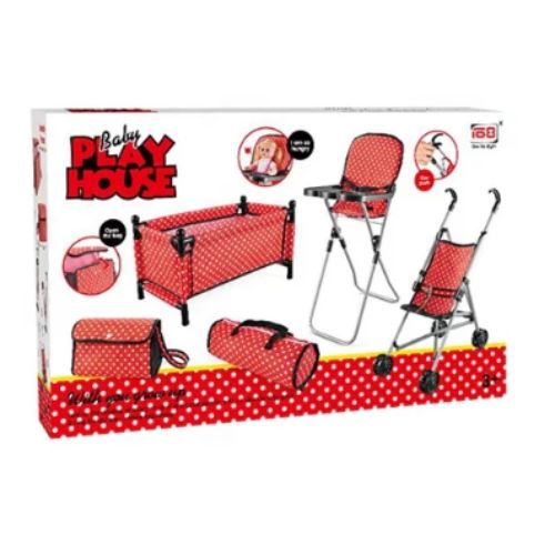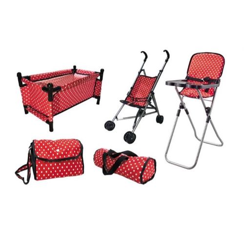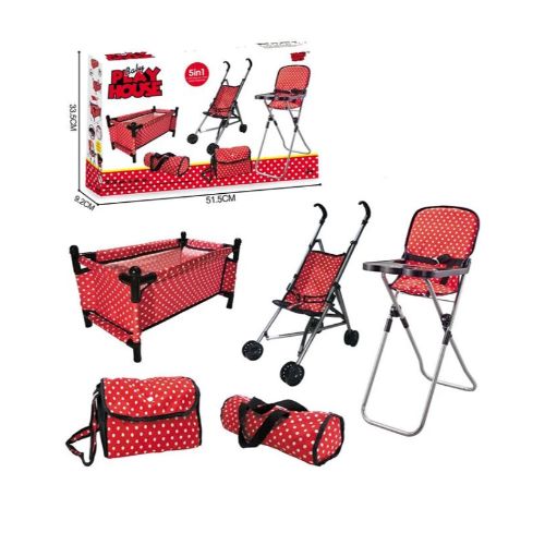 Bello set para muñecas 5 en 1, con el cual podrás cuidar a muñeca bebé. La caja contiene una cuna, silla de comer, mochila, bolso y coche de bebé. Regalo ideal para tus hijos con el cual podrás enseñarles la maravilla de criar y cuidar a los hijos. Medidas informadas son las medidas de la caja incliuyendo todos los accesorios : 59 cm x 36 cm x 9,5 cm. Las imágenes son solo referenciales. Caja no inlcuye la muñeca.